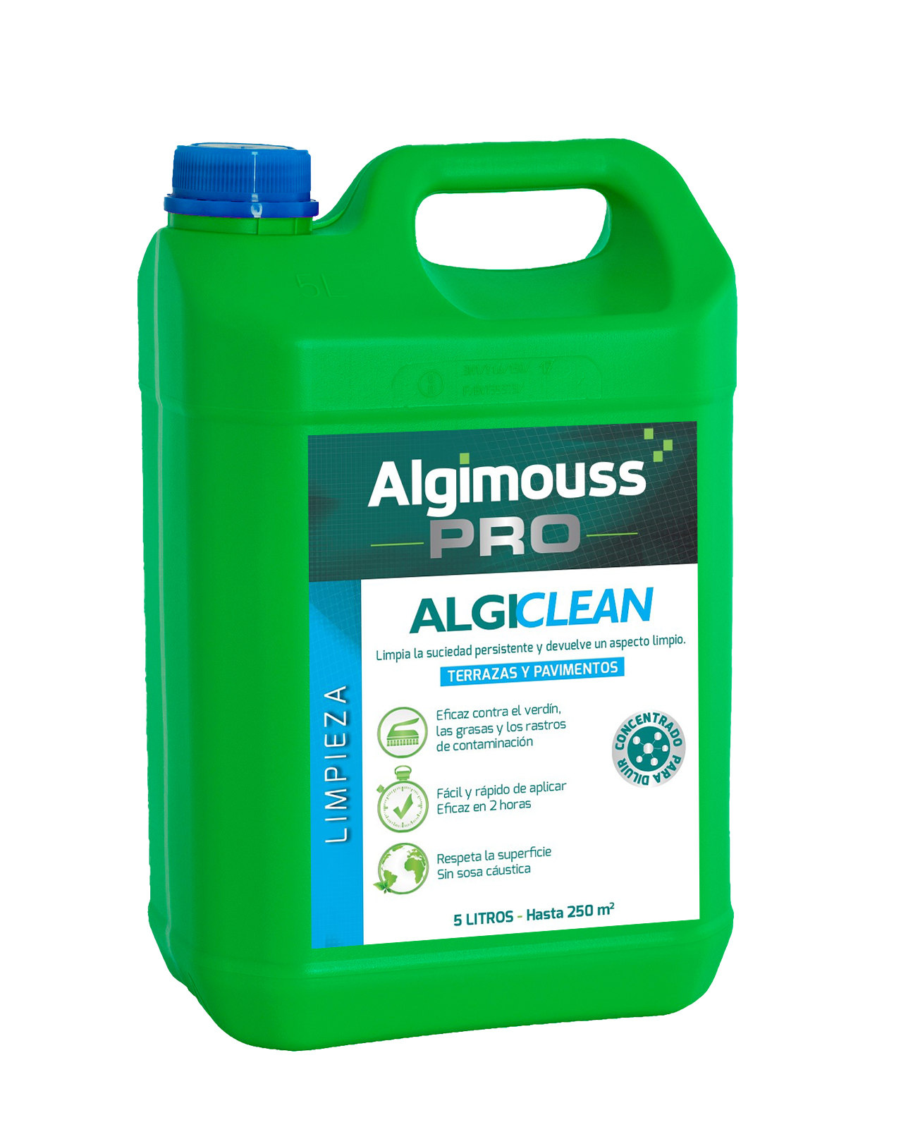 • Limpia todo tipo de microorganismos (manchas de contaminación, manchas de grasas, aceites, residuos de hidrocarburos y otras sustancias grasas incrustadas) en terrazas, pavimentos y suelos exteriores